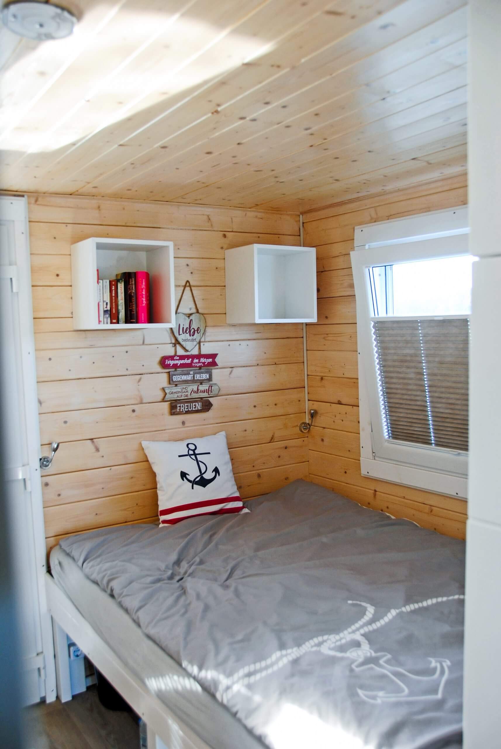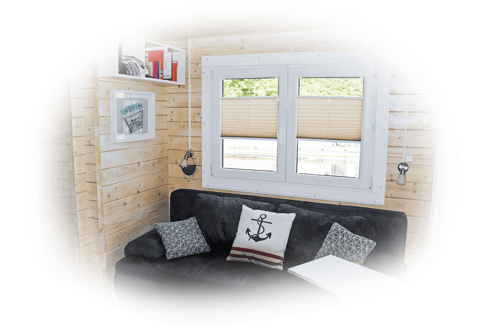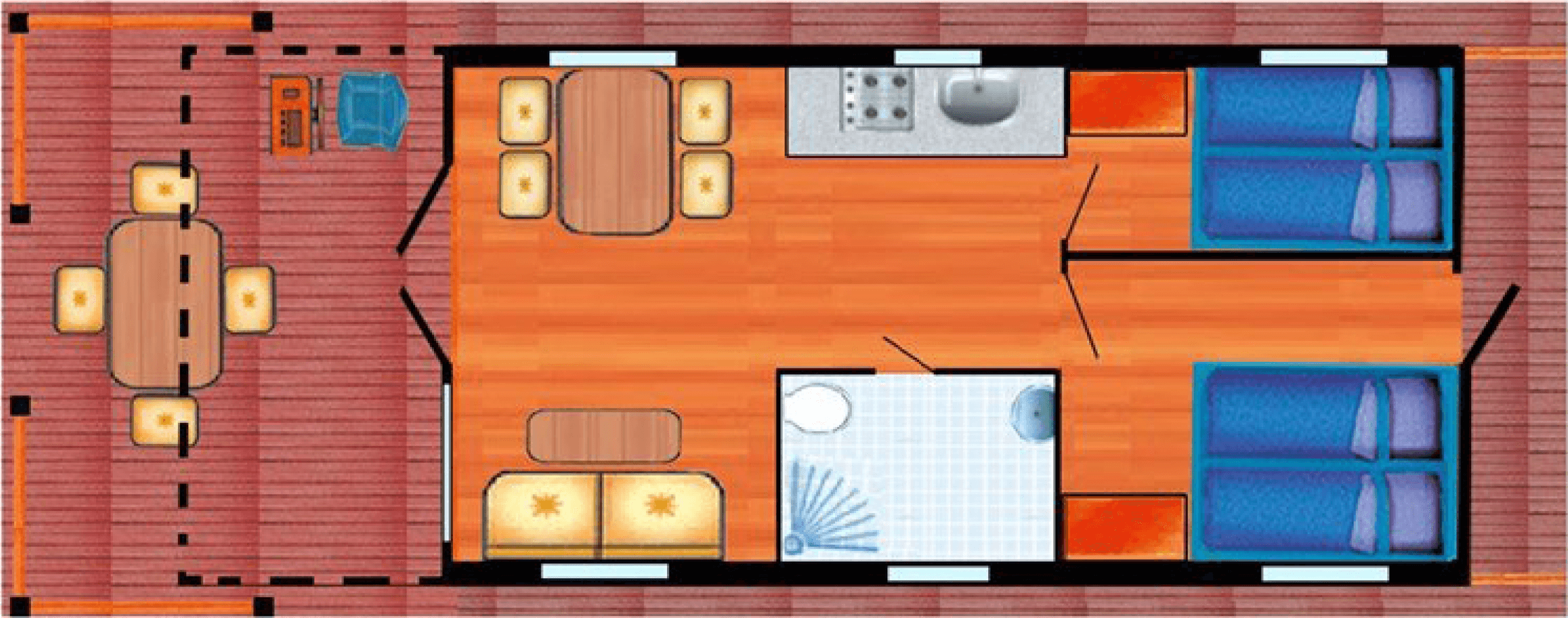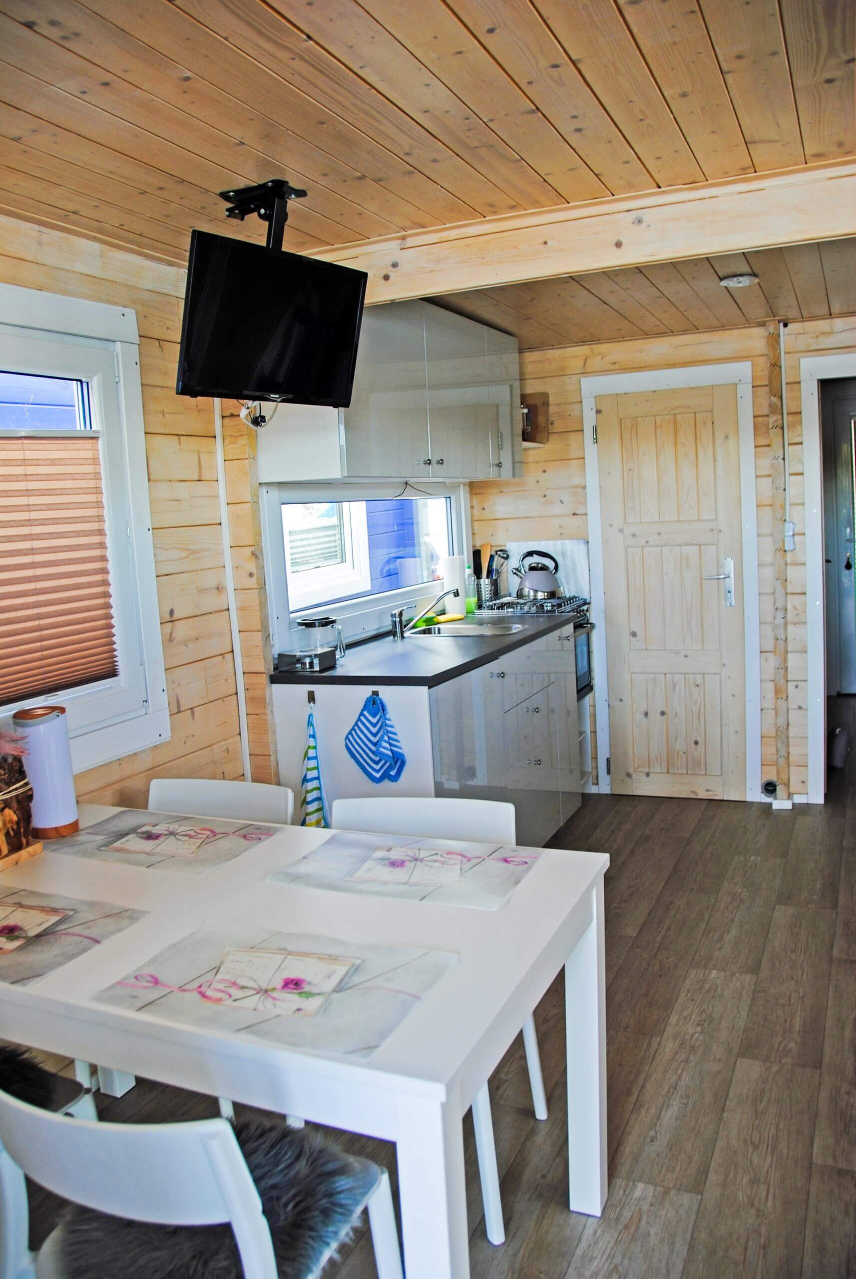 Genügend Stauraum ist vorhanden, dazu eine Couch, ein Fernseher, Tisch und Stühle für drinnen und extra für draußen.