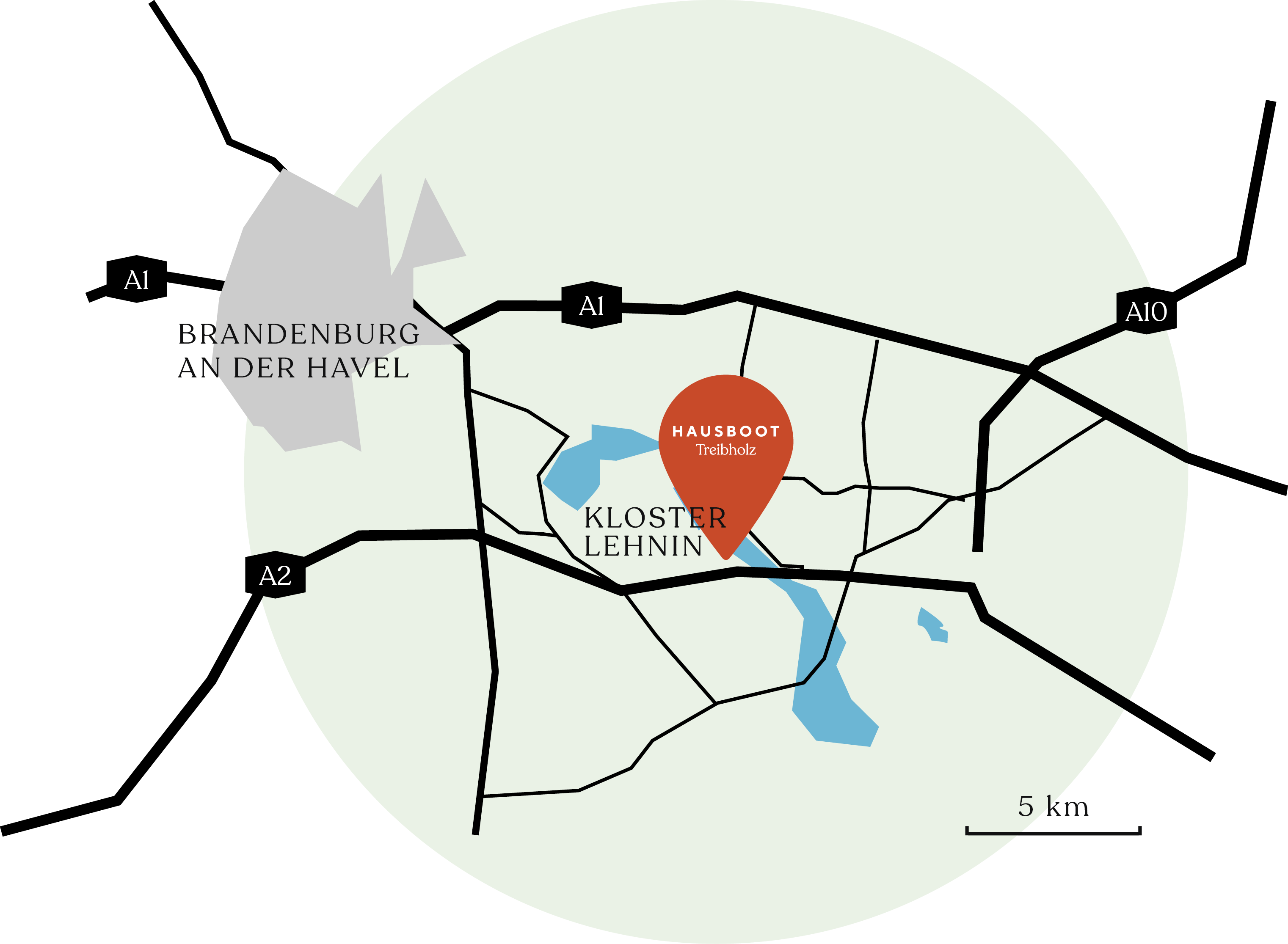 Das Hausboot Treibholz liegt im Hafen von Nahmitz am Netzener See und ist über die Autobahn A2 sehr gut zu erreichen.